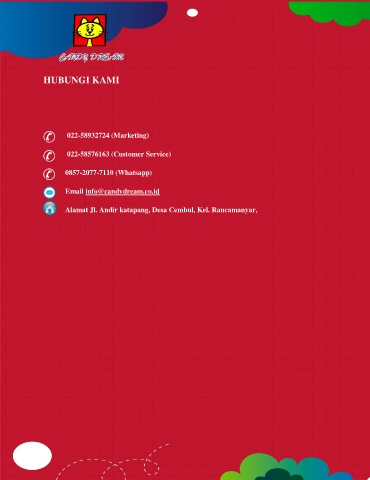 HUBUNGI KAMI 022-58932724 (Marketing) 022-58576163 (Customer Service) 0857-2077-7110 (Whatsapp) Email info@candydream.co.id Alamat Jl. Andir katapang, Desa Cembul, Kel. Rancamanyar,